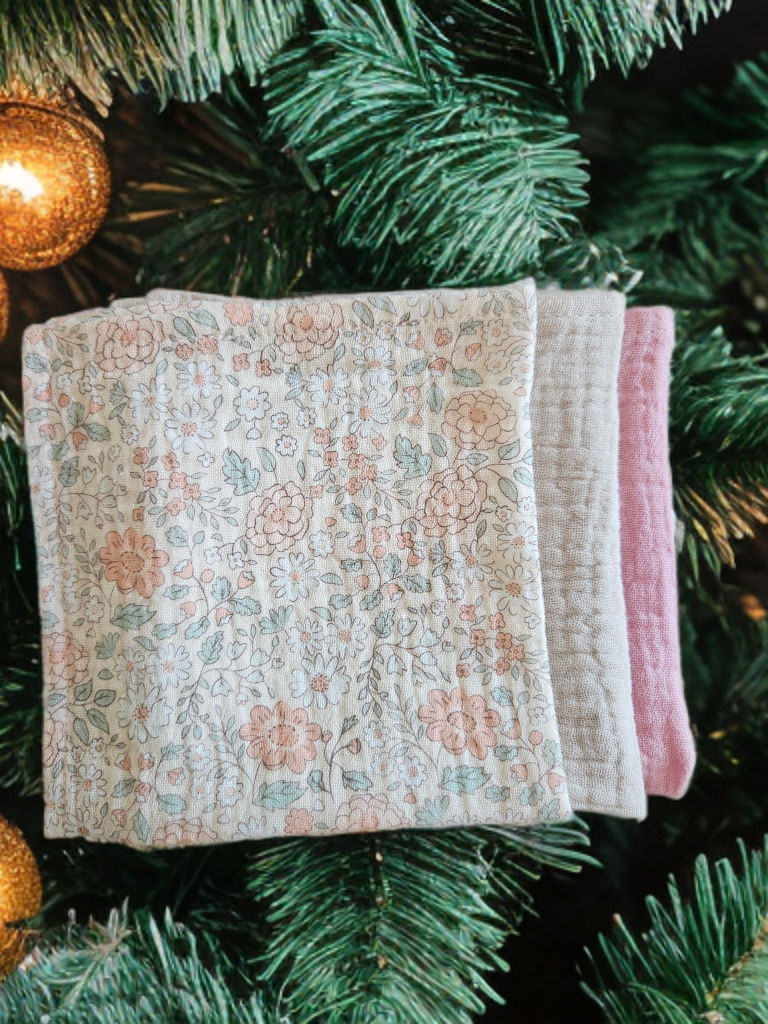 Het perfecte cadeaupakket voor de feestdagen! Deze 3 limited edition zakdoeken combineren zachte kleuren en unieke prints, waaronder onze speciale feestpatronen. Gemaakt van dubbelgaas mousseline in Oeko-Tex katoen, voelen ze heerlijk licht en comfortabel aan. Duurzaam, herbruikbaar en klaar om te geven met liefde.